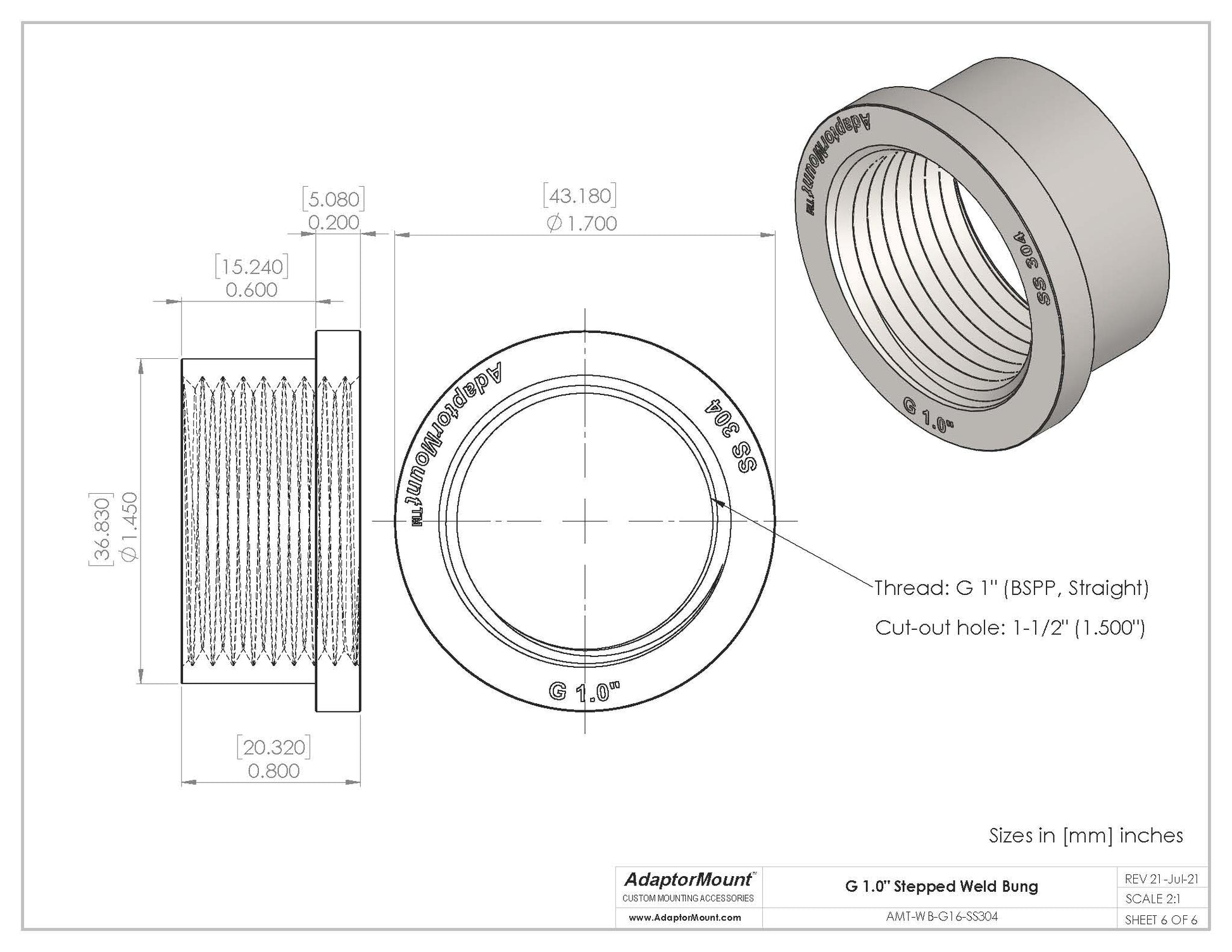 IMPORTANT NOTE: thread is straight (parallel) BSPP (G) and is the same diameter all way thought the part. (see drawing and pictures)! Stainless steel 304 weld-on bung for installations in corrosive environments. Threaded for standard G 1.0". Fits through 1-1/2" hole. Easy weld with 0.2" top head border. Laser engraved on top face for easy identification. Let us know if you have any questions.